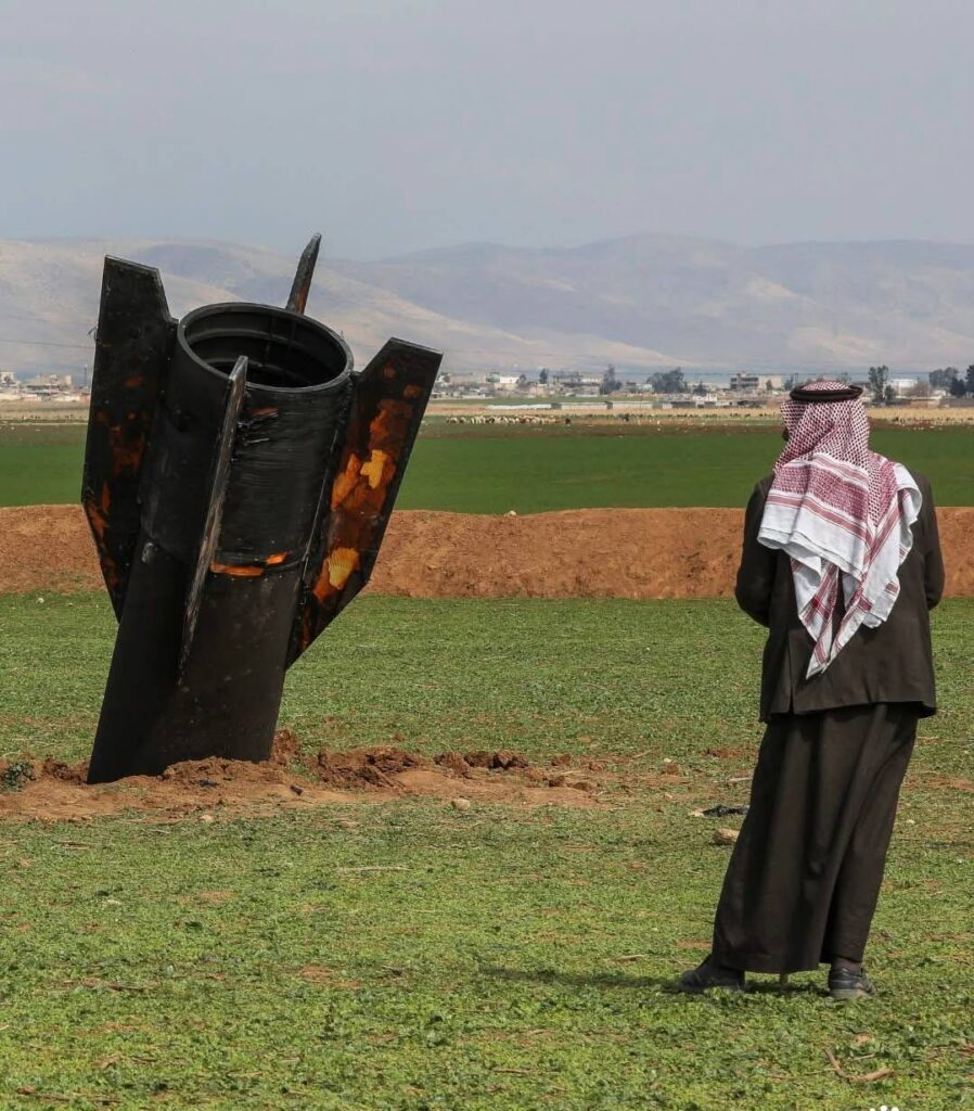 eople gathered around a missile that fell in an open space near the Kurdish-controlled city of Qamishli in northeastern Syria. No injuries were reported.