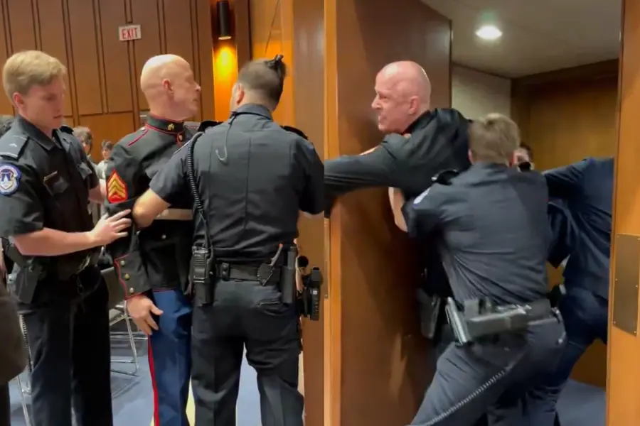 Multiple videos show that McGinnis stood up and started shouting during the Senate Armed Services hearing, and that police officers immediately grabbed him and tried to remove him from the room. McGinnis was protesting the U.S. military campaign in Iran, shouting, “America does not want to send its sons and daughters to war for Israel!”