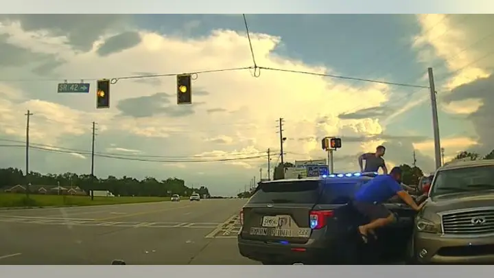 The driver backed up and pulled forward again, this time hitting two witnesses and a second police car, authorities said. She sped away going north on Highway 42 with one flat tire and police in pursuit.
