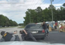 The second officer exits the police car with his gun pointed and yells, “Get your hands out of your pocket.”