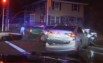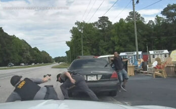 But instead, the suspect brandishes his gun and points it directly at the officer before shots are heard being fired repeatedly. The officer’s bloodied hand can be seen in the camera’s view.