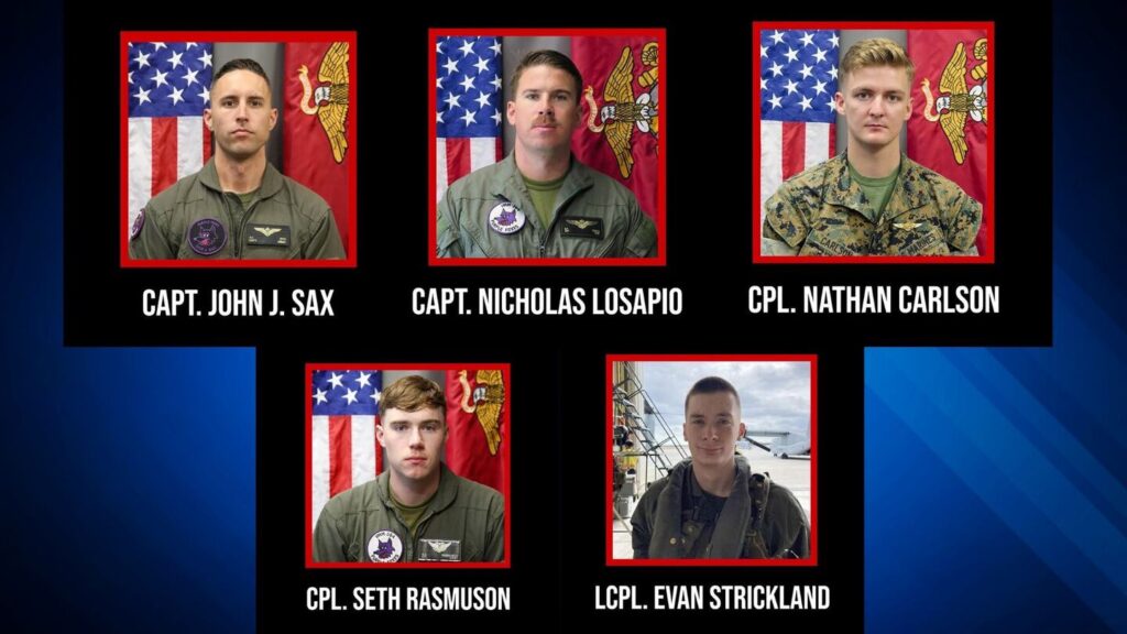 The U.S. Marine Corps has identified the five servicemembers who died when their Osprey aircraft crashed Wednesday afternoon in the Southern California desert near Glamis in Imperial County: