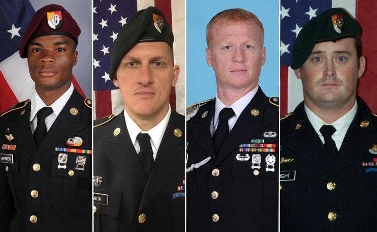 Staff Sgt. Jeremiah Johnson, 39, of Springboro, Ohio; Staff Sgt. Dustin M. Wright, 29, of Lyons, Georgia; Staff Sgt. Bryan Black, 35, of Puyallup, Washington; and Sgt. La David Johnson, 25, of Miami Gardens, Florida, died when they were ambushed by ISIS-linked militants in the village of Tongo Tongo, near the Niger–Mali border, on Oct. 4. Their deaths shone a spotlight on the little-known operations of the US military in Niger and are still under investigation.