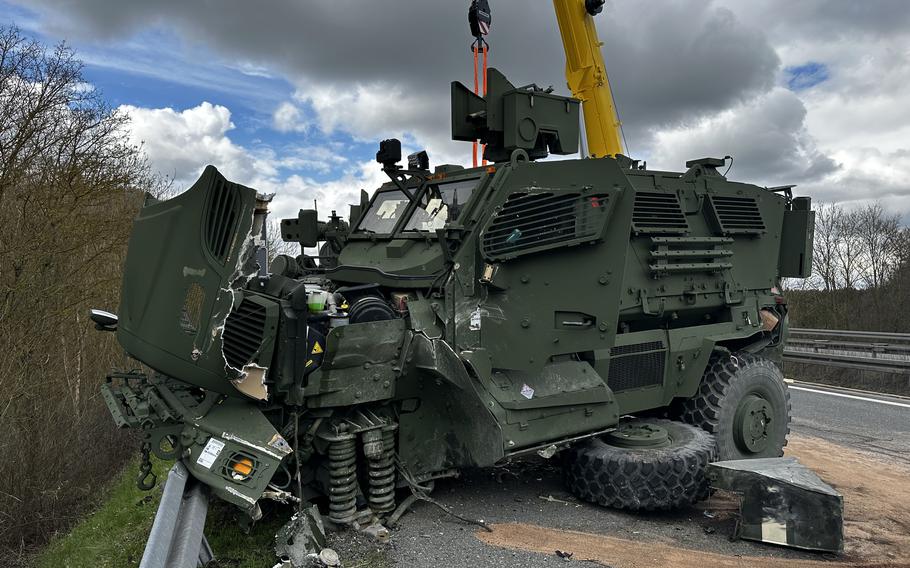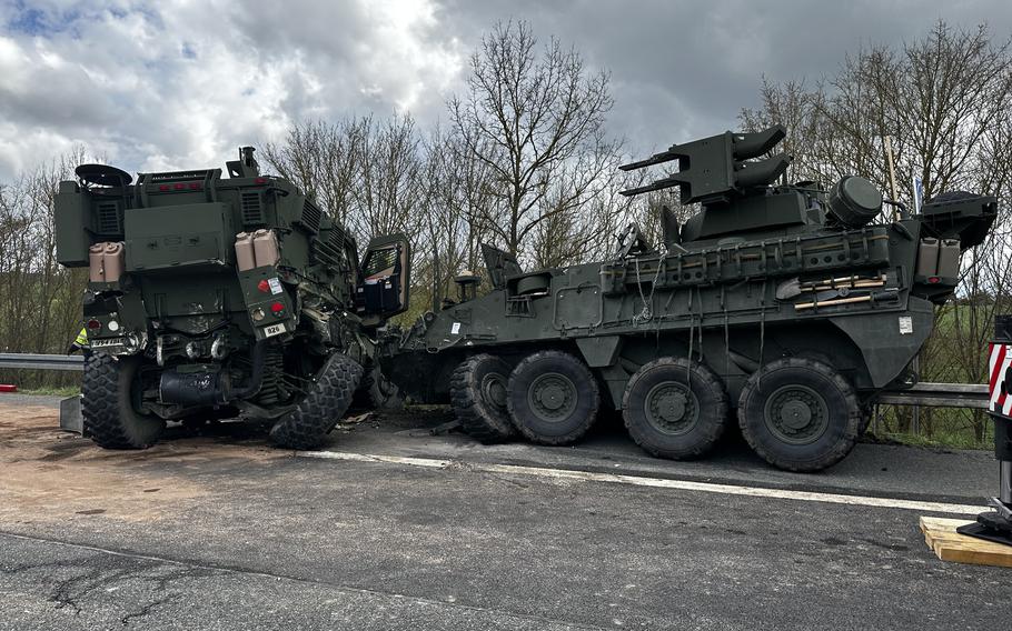 A convoy of seven armored vehicles was going from Shipton Kaserne, near Ansbach, to Grafenwoehr Training Area when a Mine Resistant Ambush Protected Vehicle collided with a Stryker, Army officials in Ansbach said. The MRAP was missing a wheel following the crash, and the Stryker also showed significant damage. A civilian semitruck also was involved in the accident, an Army statement said. German police cited “traffic-related braking” as the probable reason for the rear-end collision. The crash remains under investigation.