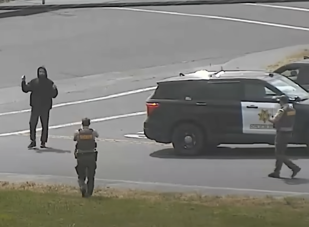 The body-cam worn by Bradford Anderson shows him standing between the two patrol vehicles, placing one between him and Nicholas Anderson, who stands by his car several yards away. The deputy leans forward with his hands on the hood, hands together with one thumb resting over the other and addresses the suspect, who is now offscreen. Then the deputy suddenly backs up and can be heard saying, “Put that down, right now.” Then, “put it down again,” with his gun, held to the side in front of him, coming into view.