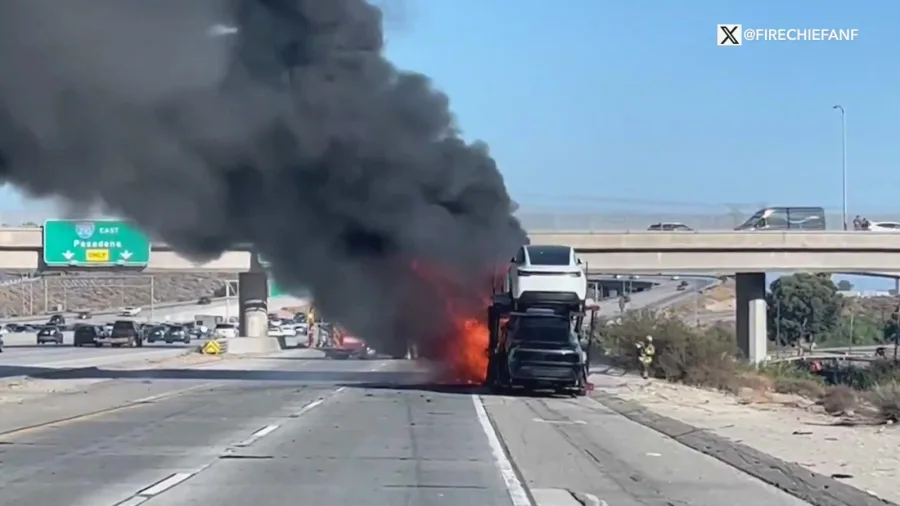 A big rig car-carrier loaded with eight Teslas caught fire on the Golden State (5) Freeway in Sylmar on Saturday, resulting in toxic smoke that shut down southbound lanes.