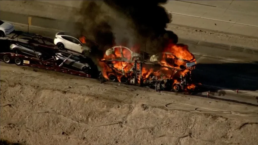 The transport with its burning load of lithium ion battery-equipped cars was off to the side of the truck lane, but the toxic smoke from the fire made it necessary to shut down all of the southbound lanes, including the truck lane, according to the CHP. Traffic was rerouted to the northbound Antelope Valley (14) Freeway.