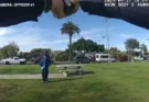 The camera footage shows the officer, who is on the hood of the car as it continues to move forward, firing what sounds like 12 shots into the windshield of the vehicle. The car drives through a ditch between the parking lot and East Dublin-Granville Road, abruptly stopping and causing the sergeant to fall onto the road.