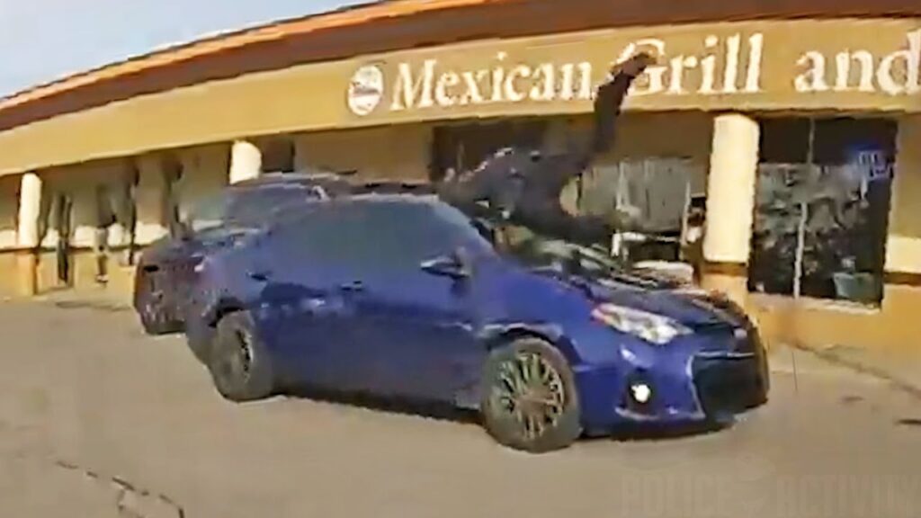 Body camera footage from the sergeant shows him approaching the Toyota Corolla with his gun drawn, giving multiple verbal commands for the car to stop as it is backing up. The car then speeds up, striking the sergeant squarely.