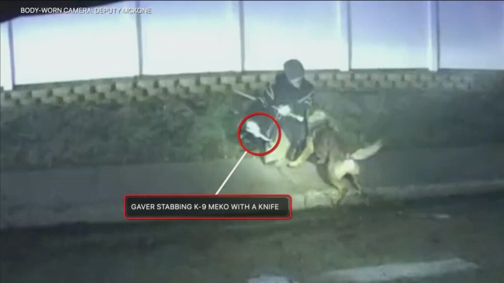 Law enforcement officials attempted to tase Gaver multiple times, and he fell to the ground. Police said he then stabbed the second police K-9 Meko. Police then shot Gaver, and he died from his injuries.