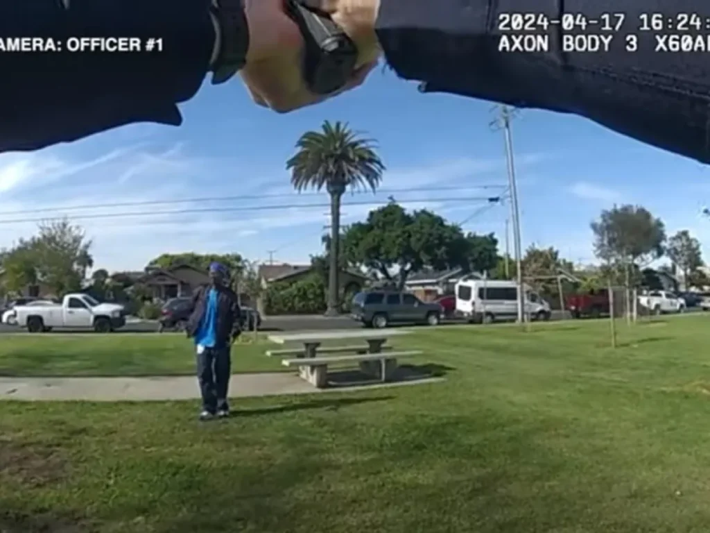 An armed man, who had a gun in his jacket pocket and was slowly backing away from Long Beach officers at MacArthur Park, pulled out the weapon and briefly extended it outward away from his side before bringing it down when he was shot twice by one of the officers, body-worn camera footage released Friday by the Long Beach Police Department shows.