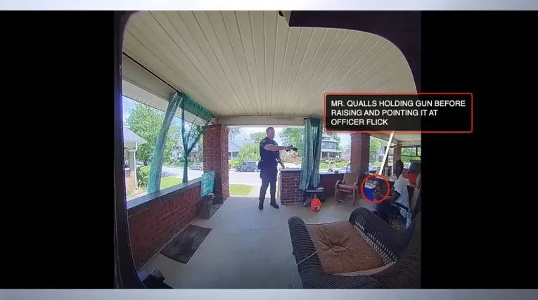After this brief exchange, the officer can be seen immediately firing at least 10 shots at Qualls while a second officer in the front yard fired at least one additional shot. In total, the shooting lasted between two and three seconds.