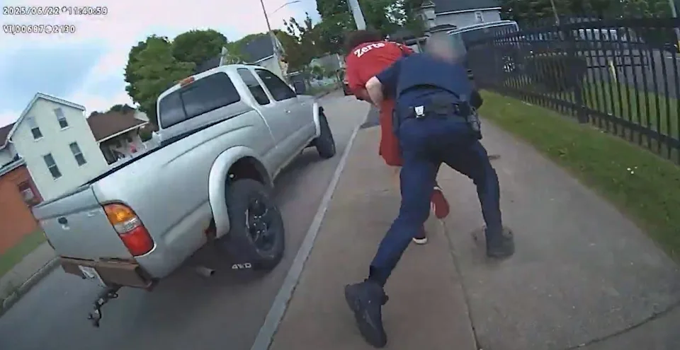 The police car then stops at LaForce Street, with Estremera-Cohen turning around and ran north as the two officers get out and chase him. A trailing officer can be seen running toward Estremera-Cohen, forcing him to turn onto Mead Street.