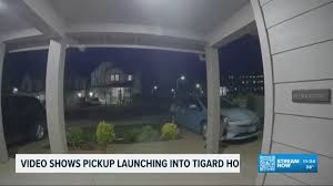 A dramatic video has captured the moment a pickup truck flew through the air and crashed into a family’s home in Tigard, Oregon, just outside Portland.